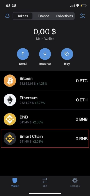 2. 在 Trust钱包 中,单击 [Smart Chain] 在 [Wallet] 选项卡以存入你的 BEP-20 BNB。 避免点击 [BNB]. 此选项适用于中币链上的 BEP-2 BNB,不能用于支付 BSC 上的交易费用。