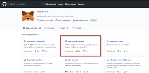1、进入github,搜索 Metamask,可以搜索到多个结果,第1个是浏览器插件代码,第2个是手机端的代码,第2个正是目标所在。