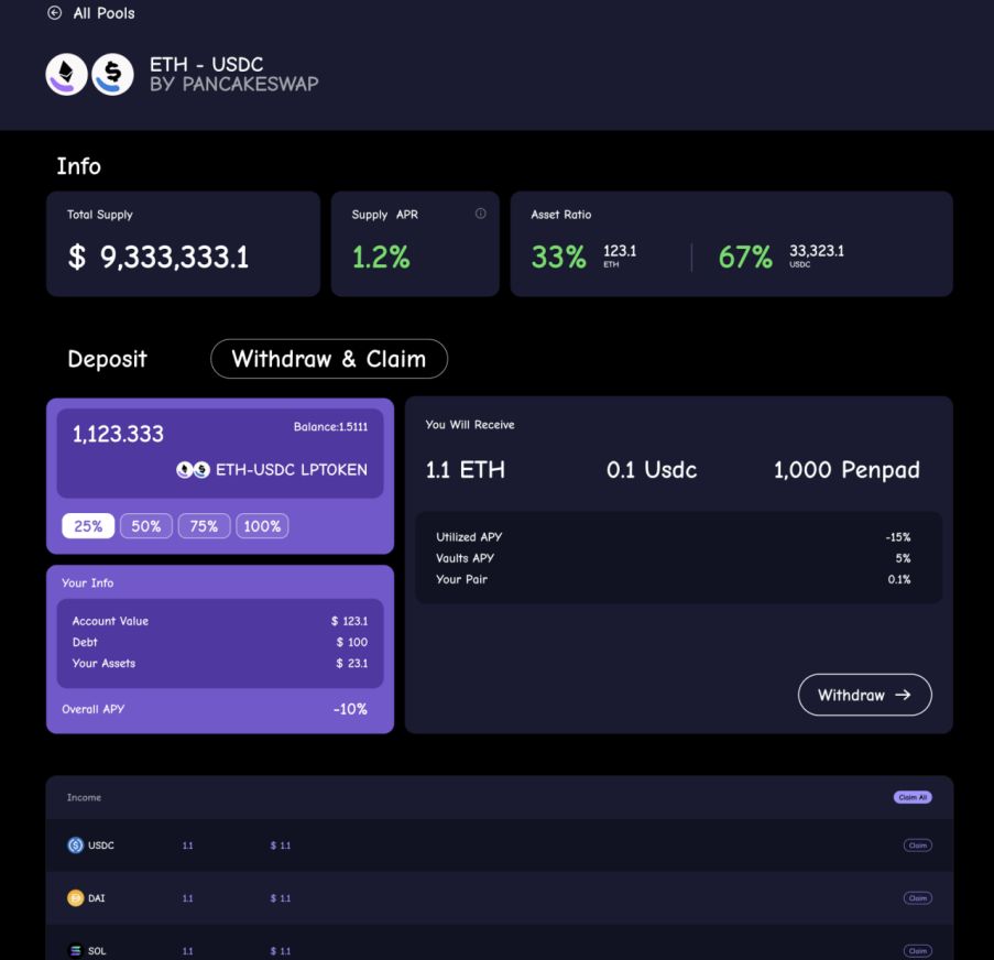 Vault 板块是 Pencils Protocol 在实现品牌升级后所推出的重要产品,其允用户在 Pencils Protocol Vaults Pool 中选择感兴趣的 LP 标的进行参与,并从中获得 LP 收入。与此同时,用户可以设定挖矿杠杆倍数,比如用户持有 1 个 ETH,可以基于此向 Vault 池进行倍数借贷,通过增加挖矿持仓的方式获得收益,Vaults 合约将自动从Staking存款池调配所需杠杆资金,满足用户对更高回报率的追求,提供便捷高效的资金增值体验。而在用户进行杠杆借贷时,他们需要支付对应的利息以支付给 Staking 用户,并在撤回 LP 后自动向合约归还资金。