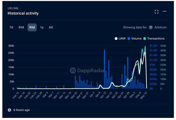 在基础用户之外,UXLINK的活跃用户数据(UAW, unique active wallets)也毫不逊色。数据显示,Friend.Tech自去年8月火热之后一度沉寂,UAW从峰值的80,000回落至1500[3]左右,24小时Transactions为2800; 而强调社交数据所有权和跨平台互动的Farcaster 日均活跃用户则呈现出稳步增长态势,DAU约为50,000[4]左右,但其整体增长速度不及UXLINK。DappRadar数据显示,自今年4月以来,UXLINK的UAW开始高速增长,目前日UAW稳定在250,000[5]上下,链上日交互(Transactions)约400,000左右。